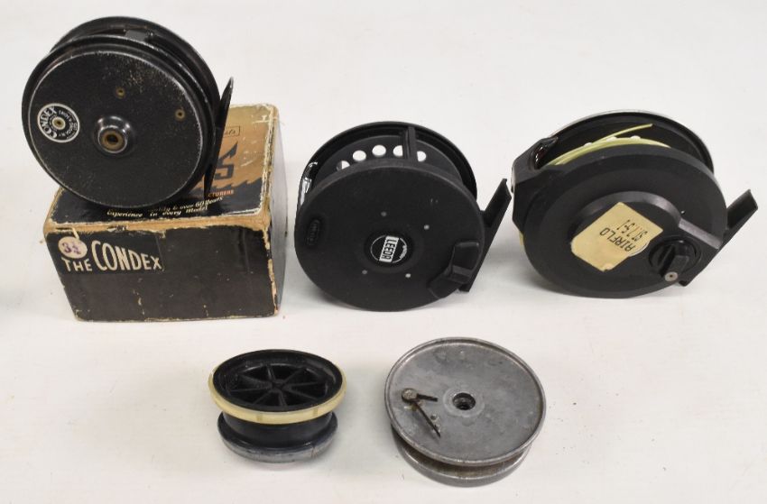 J W Young Condex 3 ¼” fly reel, black bobble finish, silk line, in MOB, a Leeda LC80 composite cassette fly reel and an Intrepid Dragonfly reel, with Airflo ST7.5I line. (3)