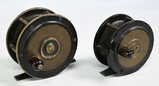 Unnamed brass and ebonite platewind centre pin reel, 4 ½” wide spool, large wood handle, constant check, 6 pillar frame, full smooth brass foot (2 small cracks to face ebonite), runs a little stiff. Unnamed brass and ebonite plate wind centre pin reel, 4” wide spool, large wood handle, constant check, 6 pillar frame, filed smooth brass foot (slight bend), runs okay. (2)