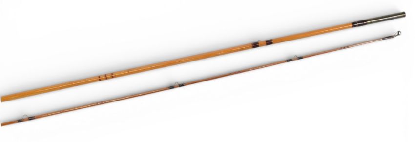 Eggington & Son, Merton SW19, split cane trout fly rod, 8ft 6” 2pc, marked ‘waterproof’, alloy uplocking reel seat and collar with wood insert, red agate lined butt/tip ring cloth bag. Light use, nice, rod quite scarce