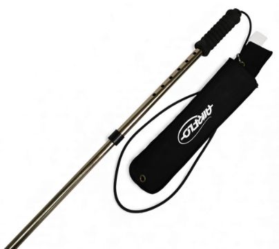 Airflow Collapsable wading stick, adjustable height, rubber foot, 5 sections, elastic tether, with 'C' clip, rubber handle, neoprene pouch with belt loop. Very light use