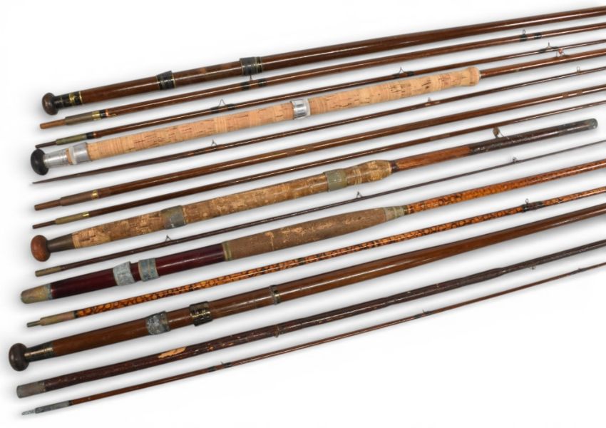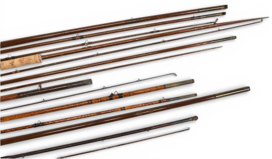 5x greenheart/bamboo antique decorator rods, in various states of repair, including a Hardy bamboo rod with short tip, a poker burned decorative fly rod, a Fred Perkins, Hereford spliced 10’ 2 piece spinning rod, four with bags, restoration project. (5)