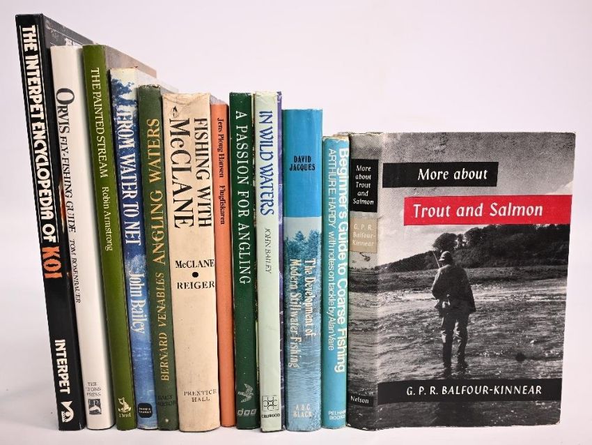 12x Fishing Books to include More about Trout and Salmon 1963 G P R Balfour-Kinnear, Beginner's Guide to Coarse Fishing 1972 Arthur Hardy, The Development of Modern Stillwater Fishing 1974 David Jacques, In Wild Waters 1989 John Bailey, A Passion for Angling 1993 Chris Yates, Bob James, Hugh Miles, Flugfiskaren (The Fly Fisherman) 1995 Jens Ploug Hansen, Fishing with McClane 1975 George Reiger, Bernard Venables Guide to Angling Waters South-East England 1954, An Angler's Album From Water to Net 1991 John Bailey, The Painted Stream A River Warden's Life 1985 Robin Armstrong, The Orvis Fly-Fishing Guide 1984 Tom Rosenbauer, The Interpet Encyclopaedia of Koi 1989. Very good-good condition with some small wear/tear to dust jacket small foxing additional writing to end pages