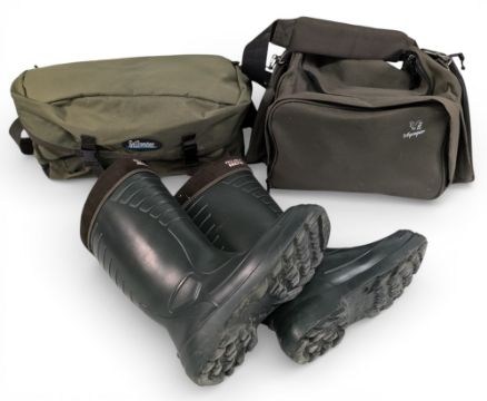 Fishing Tackle Bags: a Stillwater shoulder bag, a pair of Rovex Aric boots size 44, plus a Fox Voyager shoulder bag (with wear)