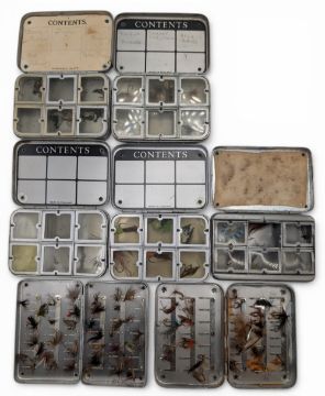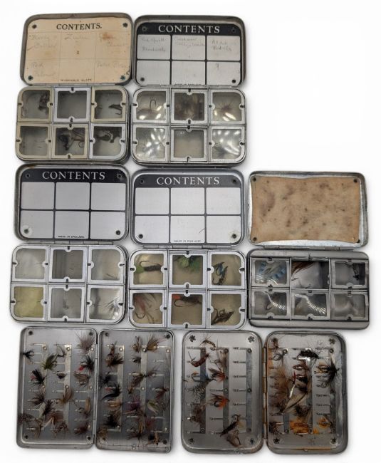 7x Wheatley Slim Alloy Fly Tins, all small sized, clip and lidded examples - one has damage - with a selection of trout flies