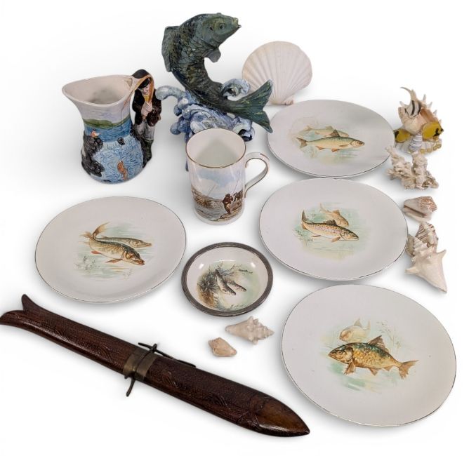 Collectables: China, to include a Spode fish bowl with plated edge, 4 wedgwood fish printed plates (one damaged), a fishing jug, cast door stop, Indian fish carved knife, assorted shell, (box of)