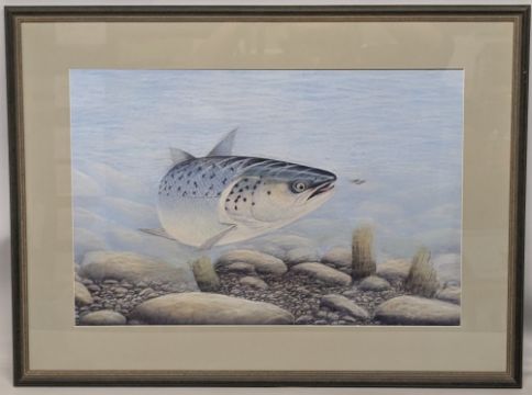 Peter Skillen: a pastel drawing of an Atlantic salmon about to take a fly, signed Peter A Skillen 2001, 31 x 46cm framed and mounted