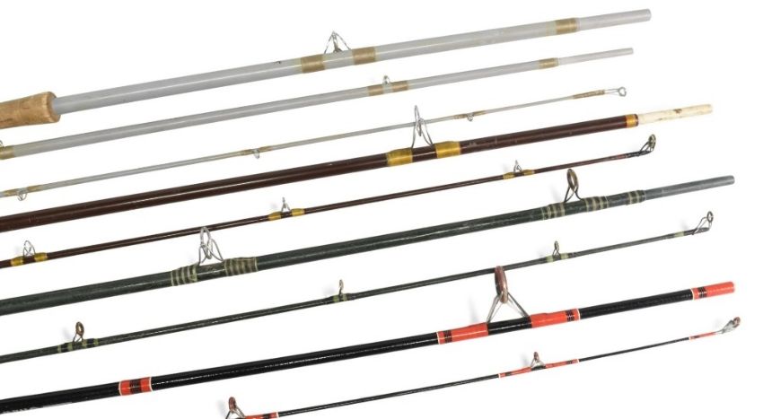 Shakespeare Odyssey carbon trout fly rod 1712-255, 2.55m (8ft 6"), 2pc line 5/6#, double alloy uplocking reel seat, lined butt ring, MCB. Very light use, nice. Plus a collection of unnamed carbon course rods, as follows: 7ft spinning 2pc. 9ft 6" spinning 2pc. 9ft spinning 2pc. 12ft 6" 3pc (broken reel seat). (5)
