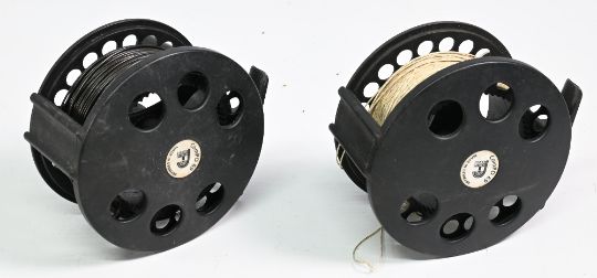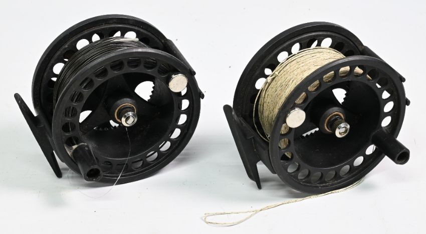 Pair of Danish Compo 69, 3 ½” diameter, wide drum fly reels, composite material, front drag adjusters, one faulty, otherwise good. (2)