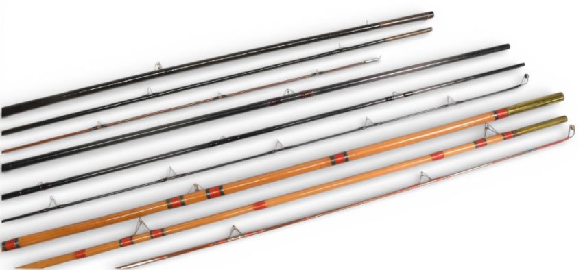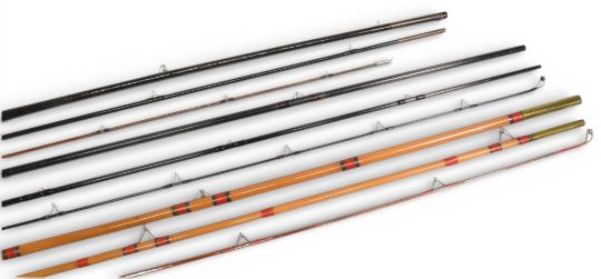 Collection of mixed use and mixed material construction rods, as follows: 1x unnamed float/match rod, Tonkin cane butt/mid section with split cane tip, 12ft 3pc, 18” handle, alloy sliding reel fittings, stand off rings, cloth bag. 1x unnamed carbon float/match rod, 13ft 6” 3pc, 24” handle, graphite sliding reel fittings, stand off rings, lined tip/butt, cloth bag, light use. 1x unnamed 10ft 6” 3pc ebonised greenheart butt/tip and cane tip, refurbished with modern snare rings, original brass fittings, tie loop joints, cloth bag (3)