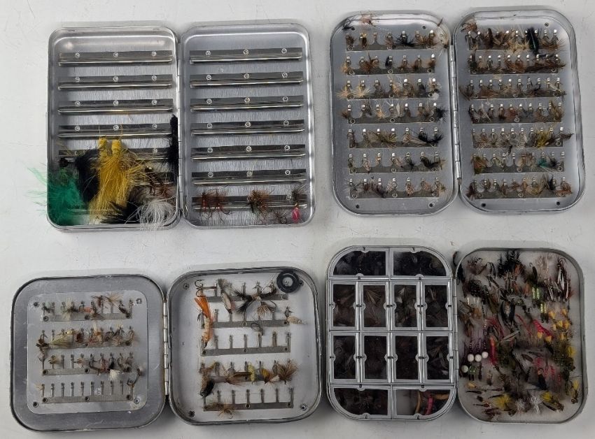 4x alloy fly/cast boxes, including a Wheatley 12 compartment dry/wet fly box with flies, double sided box with dry flies, a Perrine box with lures, and a vintage cast/fly box.
