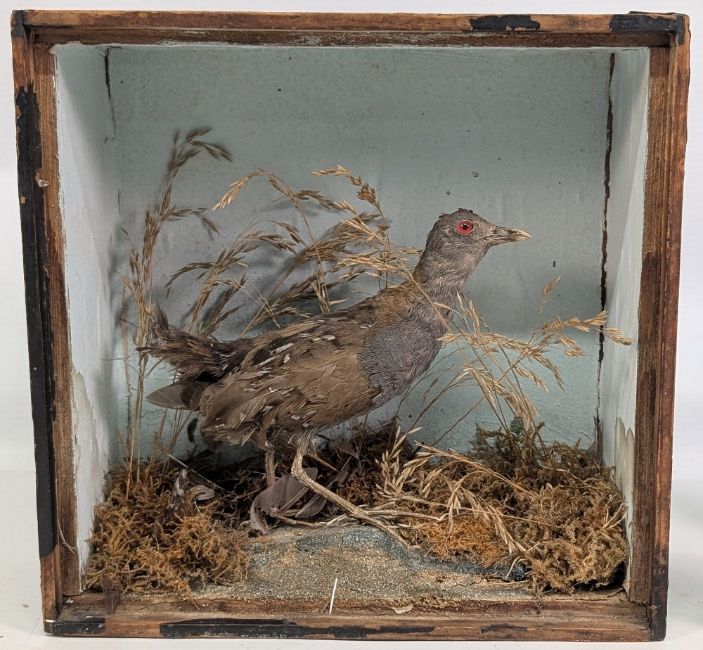 Taxidermy small period Corncrake, in wooden case, with Perspex front (with damage) 20cm x 20cm
