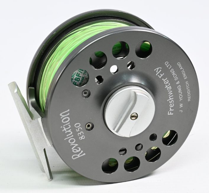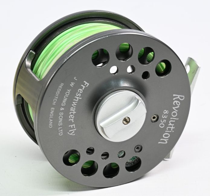 Fine JW Young & Sons Revolution 8350 Freshwater Fly centrepin reel 3.5” dia’ rear drag adjuster, quick release spool, ventilated construction, anodised finish, spins well