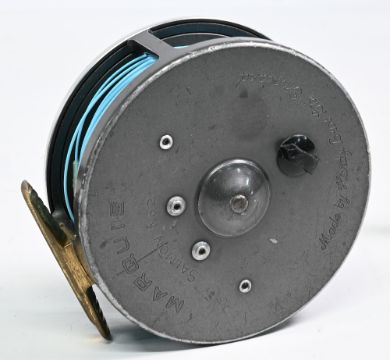 Hardy Bros “Marquis Salmon No 2” alloy salmon fly reel, 4 1/8” ventilated spool, 2 screw latch, black handle, rear tensioner and constant check, ribbed brass foot, and MZC. Light rim wear, runs very well