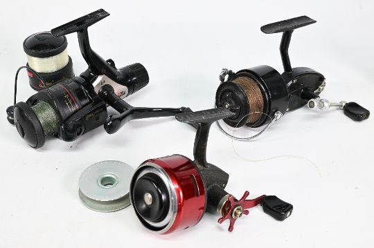 Abu Cardinal 84 fixed spool reel with spare spool, counter balanced handle, good bail, rear tensioner, runs well. Abu closed face reel with spare spool. Mitchell 300 fixed spool, good bail, on/off check, runs okay. (3)