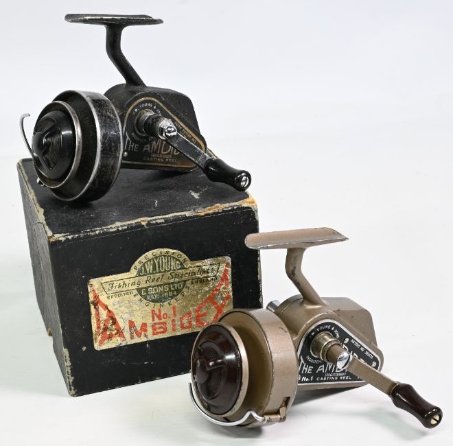 2x Youngs Ambidex fixed spool reels to include a 1st Model casting reel in black finish with interchangeable arm, t/w an Ambidex No 1 Casting reel in metallic bronze finish with interchangeable arm – c/w maker’s card box – general condition appears G overall