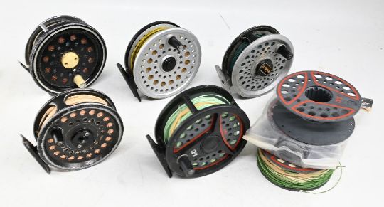 5x Various fly reels to include Ryobi 357 super light magnesium alloy fly reel 3 ¾”, Rimfly II 3 ½” dia alloy fly reel, intrepid 3 ½” fly reel, another made in Japan reel 3 ¾” alloy fly reel and a Leeda LC 100 series fly reel with 3x extra cassettes – mixed condition, with signs of use apparent