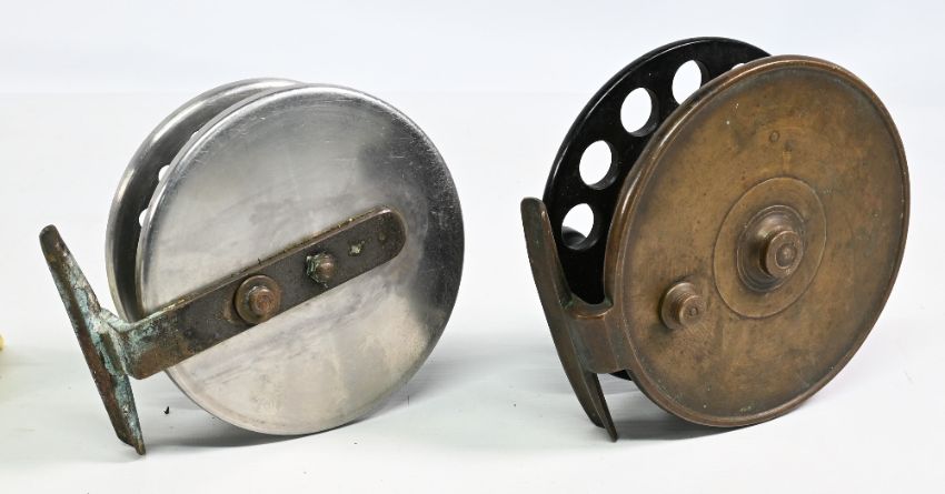 A large Facile brass and ebonite centre pin reel, 5” caged wide ventilated spool (missing one handle), on/off rear check. Grice & young Christchurch centre pin/trotting reel, 4 ¼” caged ventilated spool, twin black handles, on/off check on brass stancheon. Runs well. (2)