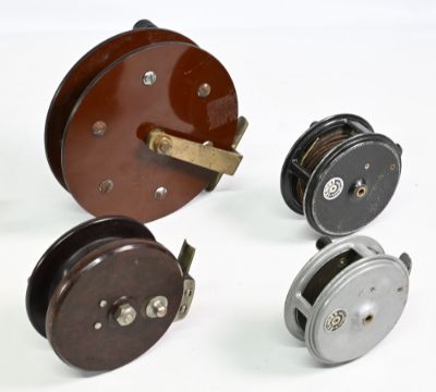 Allcock Aerialite centre pin Bakelite reel, 3 ½” spool, twin handles, on/off check. Large unnamed centre pin reel, 6” caged spool, twin turned wood handles, brass stancheon and foot. J W Young Condex alloy reel, 3 ½” wide spool, black handle, constant check, runs well. J W Young Condex alloy reel, 3 ¼” narrow spool, black handle, constant check, runs well. (4)
