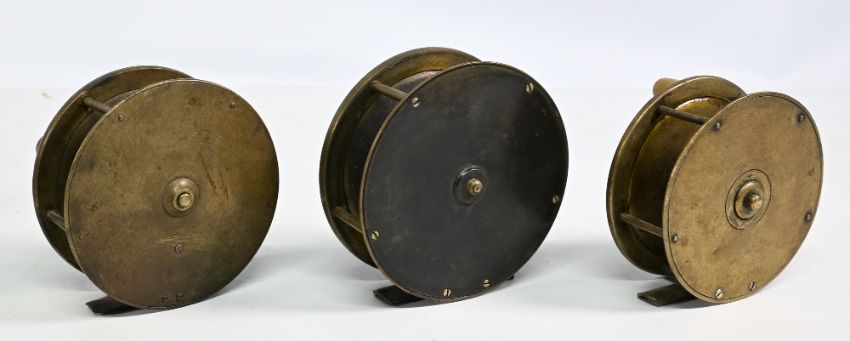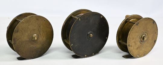 A collection of all brass salmon unnamed wide spool reels, all look original and work. Made up of 1x 4” 1x 4 ¼”, and 1x 4 ½”. (3)