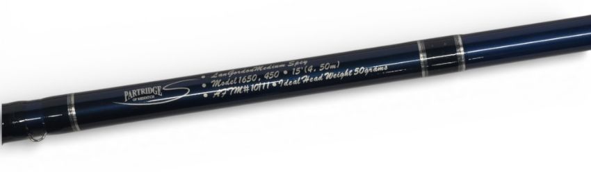Partridge Redditch Ian Gordon medium Spey No 1650.450 carbon salmon fly rod, 15ft 4pc line 10/11#, ideal head weight 50g, 27” handle, alloy double down locking reel seat and collar, lined stripping rings, MCB and zip top triangle Cordura tube. Very light use