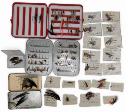 Collection of Flies, Nymphs, dry trout and a few salmon flies, and tubes, a selection of named flies on paper, Leeda case, collection of Allcocks salmon flies carded, Wheatley slim alloy clip case with trout flies,