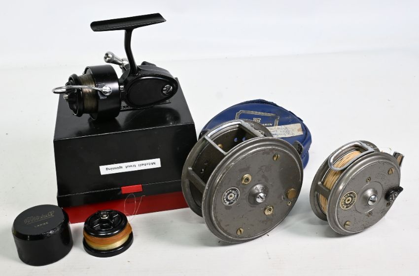 3x Various Fishing reels to include Garcia Mitchell 309 spinning reel RHW rear optional check lever, full bail arm, with spare spool and case in maker’s case in good overall condition, t/w a JW Youngs & Son 4” Beaulite grey finish reel, wear apparent, slight rim damage, and JW Youngs & Son 3 ¼” Beaulite alloy fly reel in grey bobbled finish, and a Hardy Broz zip case (used) - signs of use apparent – condition mixed throughout
