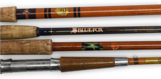 Normark Blue Fox carbon spinning rod, 10ft 2pc, 15-40g CW, 23” handle, uplocking reel seat, lined rings, light use, no bag. Martin James hollow glass spinning rod, 10ft 2pc, 28” handle, uplocking reel seat, lined butt/tip rings, cloth bag. Unnamed solid glass spinning rod, 6ft 6” 2pc, 24” wood handle, alloy reel seat, lined rings, bag. Gordons of Worksop hollow glass match/float rod, 12ft 6” 3pc, 26” handle with alloy sliding reel fittings, stand off rings, lined butt/tip rings, cloth bag, light use. (4)