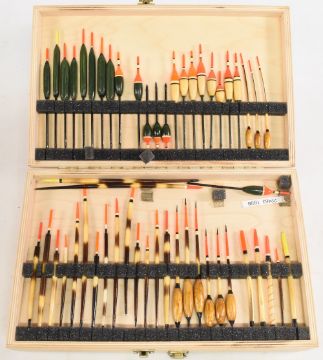 Fine collection of 72 handmade floats, including quills, balsa and cork on cane, in Avon, Zoomer and perch bobber patterns, come in a 3 layer wooden box 14”x9”