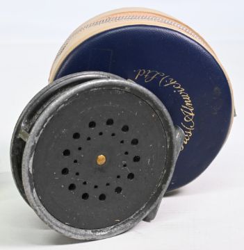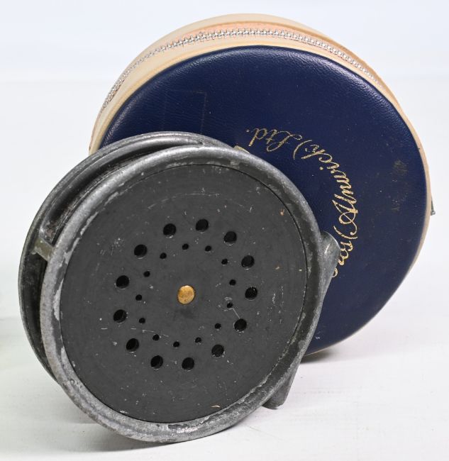 Hardy Bros Perfect 3 5/8” alloy trout fly reel smooth alloy foot, black handle, rim tensioner, constant check, surface wear and signs of use apparent, still in working order, in maker’s zipped case