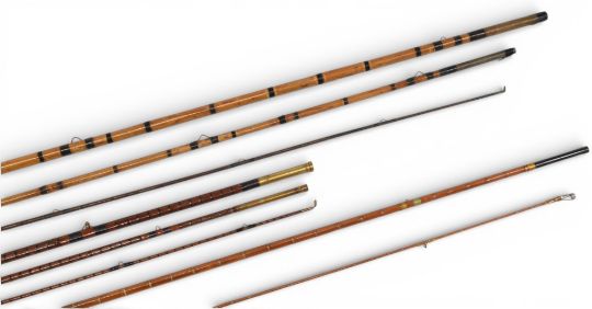 J E Miller of Leeds split cane c1924 trout fly rod, 9ft 6” 3pc, grooved wooden handle, brass sliding reel seat, red agate butt/tip rings, cloth bag. Looks refurbished. Unnamed split cane fly rod, 8ft 2pc, alloy uplocking reel seat, red gate butt/tip rings, cloth bag. Refurbished. Unnamed whole cane with greenheart tip, 12ft 3pc, brass reel seat, tie lock joints, cloth bag. (2)