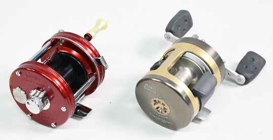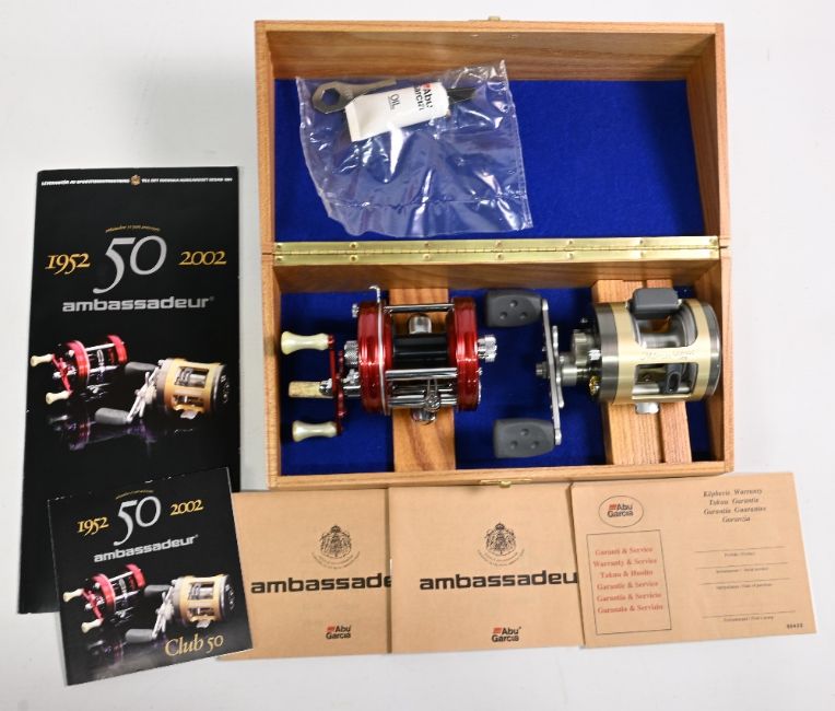 ABU Ambassadeur 50th Anniversary Set of Reels 1952-2002 to include a No 5000 multiplier reel in red finish with ‘Record Ambassadeur’ to face plate foot stamped 941/1800, t/w a Morrum SX3600C MCB multiplier reel foot stamped 941/1800 – finely presented in maker’s wooden case and card box, with paper’s etc – appears in very good condition throughout