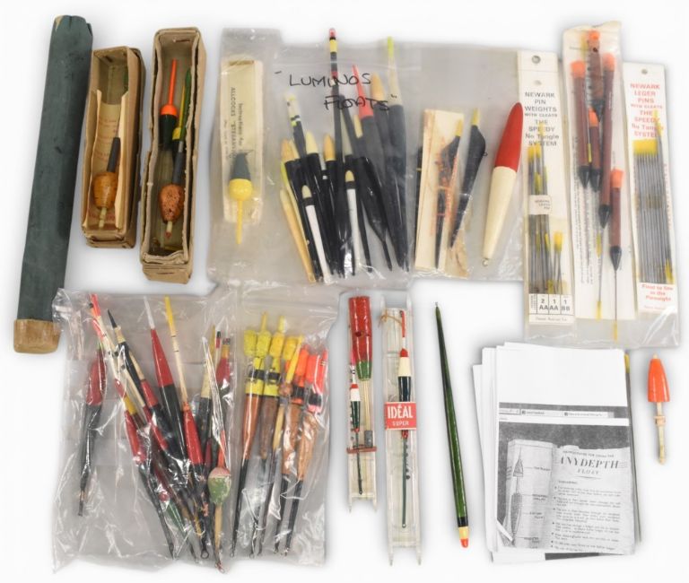 Good collection of rare coarse fishing floats, including Turner’s, Longjohn alloy float with instructions, in original tube, The Kelby wind beater float, alloy/cork sliding body, with papers in box, the Zip-Stick foam/glass float in card box, various Newark needle floats with pins, a French Ideal super winder with float, various cork/quill Avon patterns, an Allcock Stream Search float with paper, plus 2 others, plus collection of luminous floats.