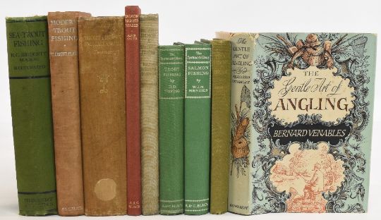 Period Fishing Books to include The Art of Angling 1955 Bernard Venables, Trout Fishing in Brooks Its Science and Art 1920 G Garrow-Green, Salmon Fishing 1950 W J M Menzies, Trout Fishing 1943 H D Turing, Modern Salmon and Sea Trout Fishing 1938 Major Kenneth Dawson, Salmon Secrets Shared Captain 1950 A P R Smith, Lonsdale Library Trout Fishing from all Angles 1929 Eric Teverner, Modern Trout Fishing 1942 W Carter Platts, Sea-Trout Fishing 1929 R C Bridgett (9); in generally in good condition with some foxing, marks, small wear/tear