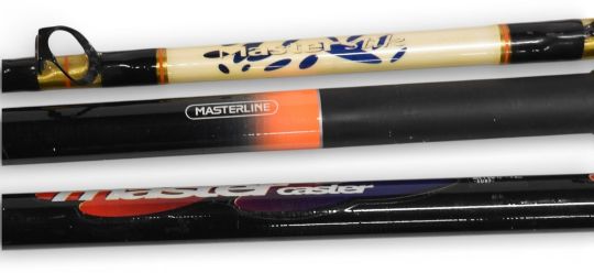 Masterline Master Caster 12’ 2 piece surf fishing rod, 4-8oz, a similar rod 6-8oz, both clean, used condition, and a Masterline Master Stick, 6’ one piece, heavy duty boat rod with 3 leg double whipped guides, no TC showing, probably 50lb class, no bags. (3)