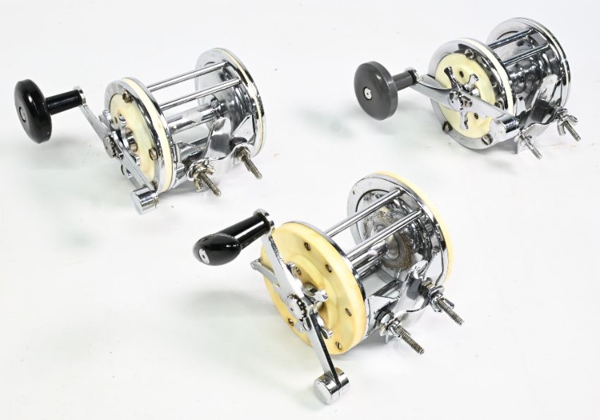 3x Garcia Mitchell Sea fishing multipliers, 624 Captain, 622, both little used and a 604, hairline fracture to the winding plate, in 3 zip reel bags. (3)