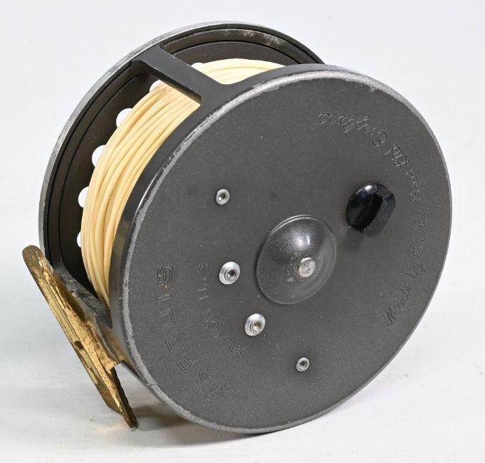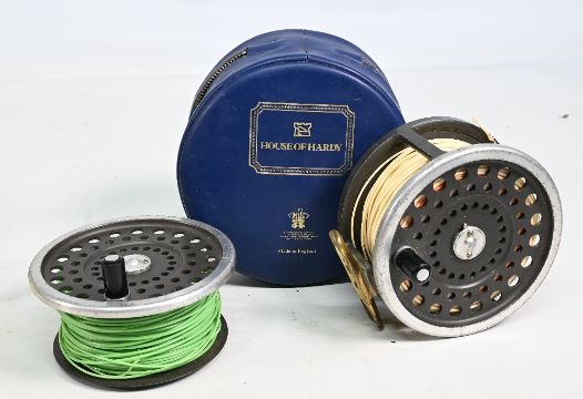 House of Hardy Marquis Salmon No 3 alloy fly reel and spare spool (2) ribbed brass foot, quick release spool, rear drag adjuster, surface wear apparent, appears working with maker’s zip case