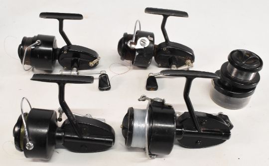 Mitchell 330 Otomatic finger dab reel, a Mitchell 301 RHW reel, another similar but lacking handle knob and a Garcia Mitchell 300, working/used, plus 2 spare spools. (5)