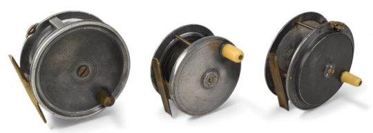 3x Alloy salmon fly reels, made by David Slater of Newark, including a 4 ¾" recessed plate wind, rim tension regulator, brass foot, Silent line recovery function, a 4 ½" Army & Navy, London, Hercules pattern with rim tension regulator, white handle, brass foot, and a 4" plate wind stamped "J Bernard & Son, Makers", white handle, Bernard engraved to front rim, but lacking tension regulator. (3)