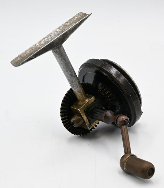 Carswells modified Illingworth reel, RHW, manual half bail, faint hairline crack to spool, reel turns fine.