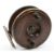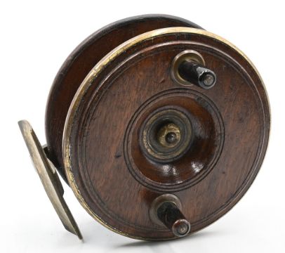 Rare brass bound mahogany Nottingham reel, 3 ¾” diameter, twin painted brass handles on seats, central drum nut, brass bound front rim on external brass disc plate, holding the internal check.