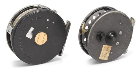 Hardy Bros "The Marquis 6" multiplier alloy trout fly reel 3 ¼" ventilated spool, 2 screw latch, black handle, rear tensioner, constant check, 'U' shaped alloy line guide and foot. Some loss to face and signs of wear, runs well. Ryobi alloy trout fly reel 3 ½" ventilated spool, 2 screw latch, black handle, milled rim tensioner, constant check, alloy line guide and foot, MZC. Signs of wear, runs well. (2)
