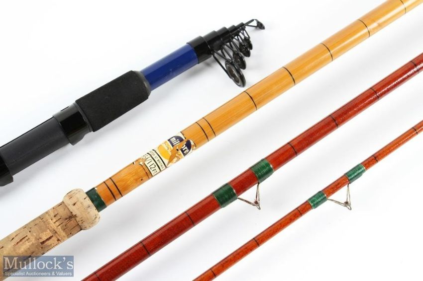 Milbro Caledonian glass float rod 12' 3pc, 22" mushroom handle with sliding reel fittings, stand off rings, MCB; Masterline Premier telescopic spinning rod 8' 5 sections, 18" composite handle with uplocking reel seat (2)