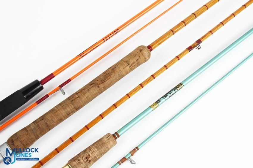 Unnamed split cane spinning rod - 8ft 2pc 2" handle, alloy uplocking reel seat, red agate butt/tip rings, cloth bag; Shakespeare 1411-180 solid glass spinning rod - 6ft 2pc 13" composite handle, alloy down locking reel seat, light use, cloth bag; Milbro "The Dart" solid glass spinning rod F62/11 - 7ft 2pc 14" handle, alloy uplocking reel seat, no bag (3)