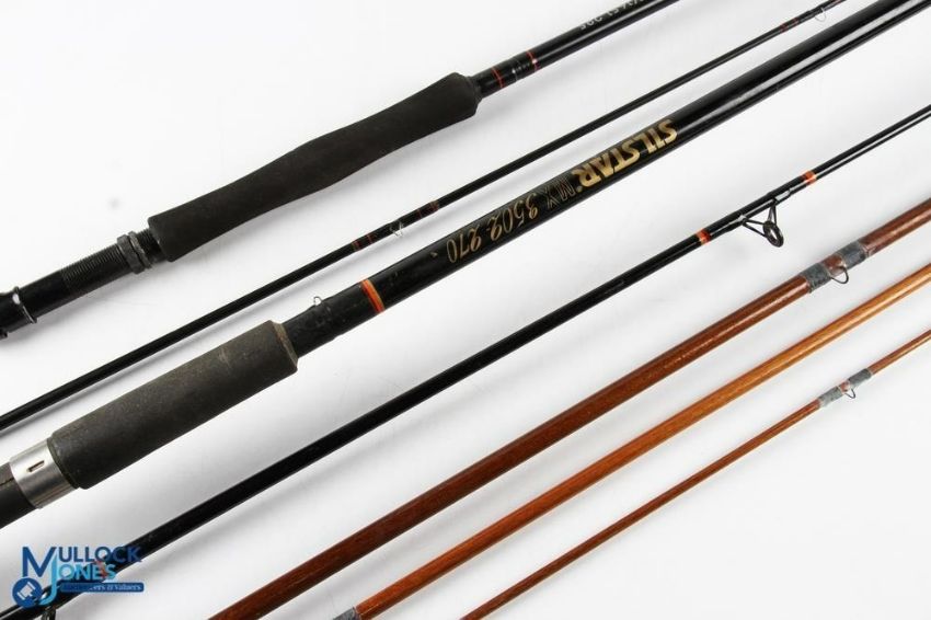 Silstar MX 3502-270, 9' 2 piece hollow glass spinning rod with lined guides, action 40-80grams, a Shakespeare Omni fly rod, 9' 2 piece for line #6/7, Duplon handle plus an antique greenheart 12' 3 piece fly rod with brass fittings, A/F, in cloth bag. (3)