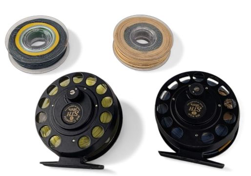 Pair of STH2 alloy fly reels made in Argentina, models MRPOP and MR Cassette, both 3 ¼" diameter, backplate adjusters, c/w 2 spare spools and lines, good. (4)