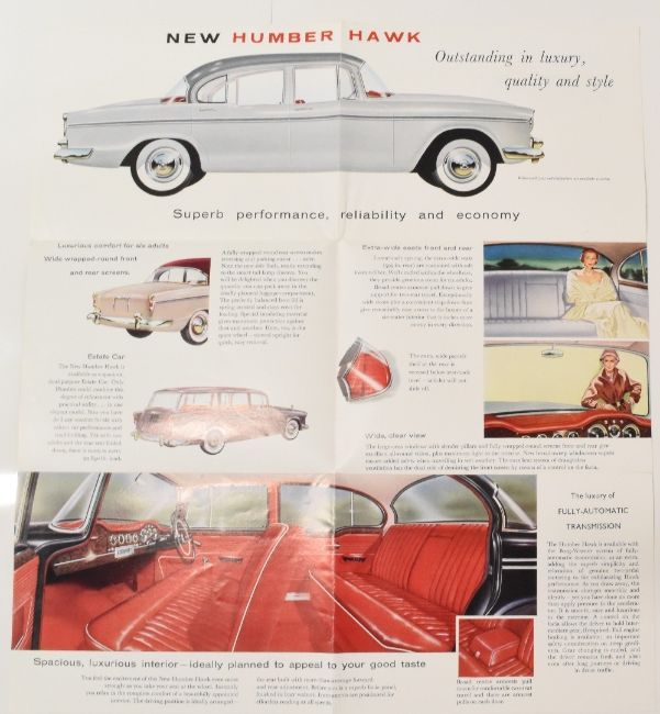 AUTOMOBILES: New Humber Hawk 1960. Fold out brochure illustrating and detailing with specifications these 3 models. Printed on semi-gloss paper, folds out to size 14¾" x 16½". Manufactured in Coventry