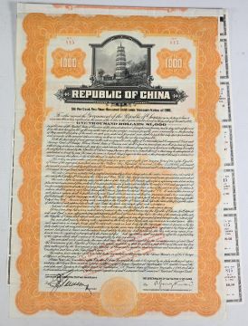 PICTORIAL: GOVERNMENT BOND. CHINA REPUBLIC of China - 6% two year Secured Gold Loan Treasury Note of 1919. Bearer Bond for US $1,000. Pagoda top centre, ornate black and yellow printing by American Banknote Company, size 10" x 14¾", plus coupons