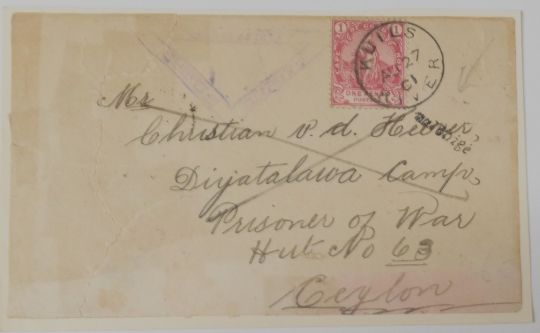 POSTAL HISTORY: SOUTH AFRICA BOER WAR envelope front sent to Prisoner of War Camp in Ceylon 27th August 1901. Has Cape Colony Stamp, posted to Diyatalawa Camp in Ceylon, size 5" x 3"