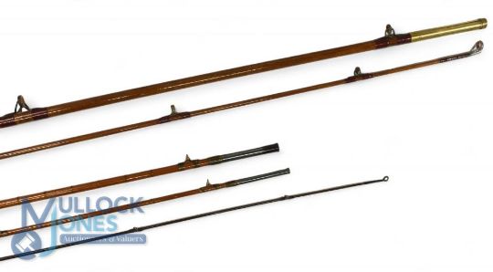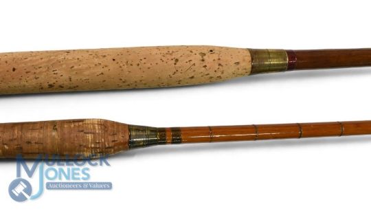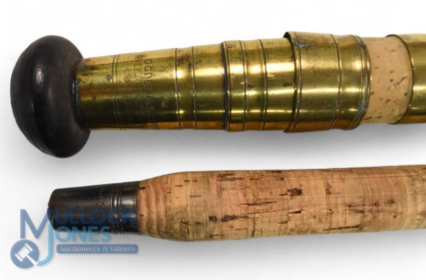 Ogden & Scotford of Leicester Square, London, 7'6", 2 piece greenheart spinning rod, burgundy whipped red agate guides, brass fittings, sheet cork handle, pin stop ferrule, revarnished, good. 3/4 Farlow of London split cane/greenheart fly rod with wrong tip, for spares or repairs (2)