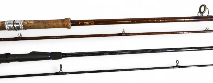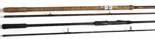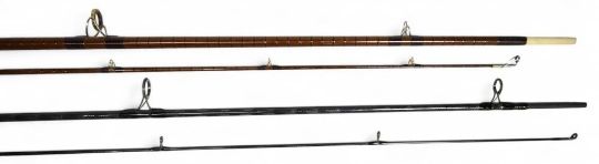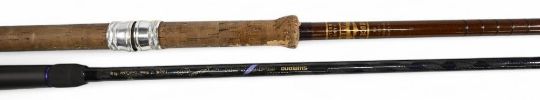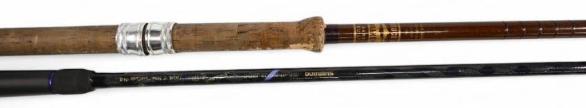 Bruce and Walker MK IV Avon G Compound taper carbon rod 11ft 2pc 29" handle, with polished alloy sliding reel fittings, lined butt/tip ring, MCB (tatty) - light use and Shimano Flash Specimen carbon carp rod 12ft 2pc 1 3/4lb test curve, composite grip, uplocking reel seat, lined rings throughout, MCB (Tatty) - light use